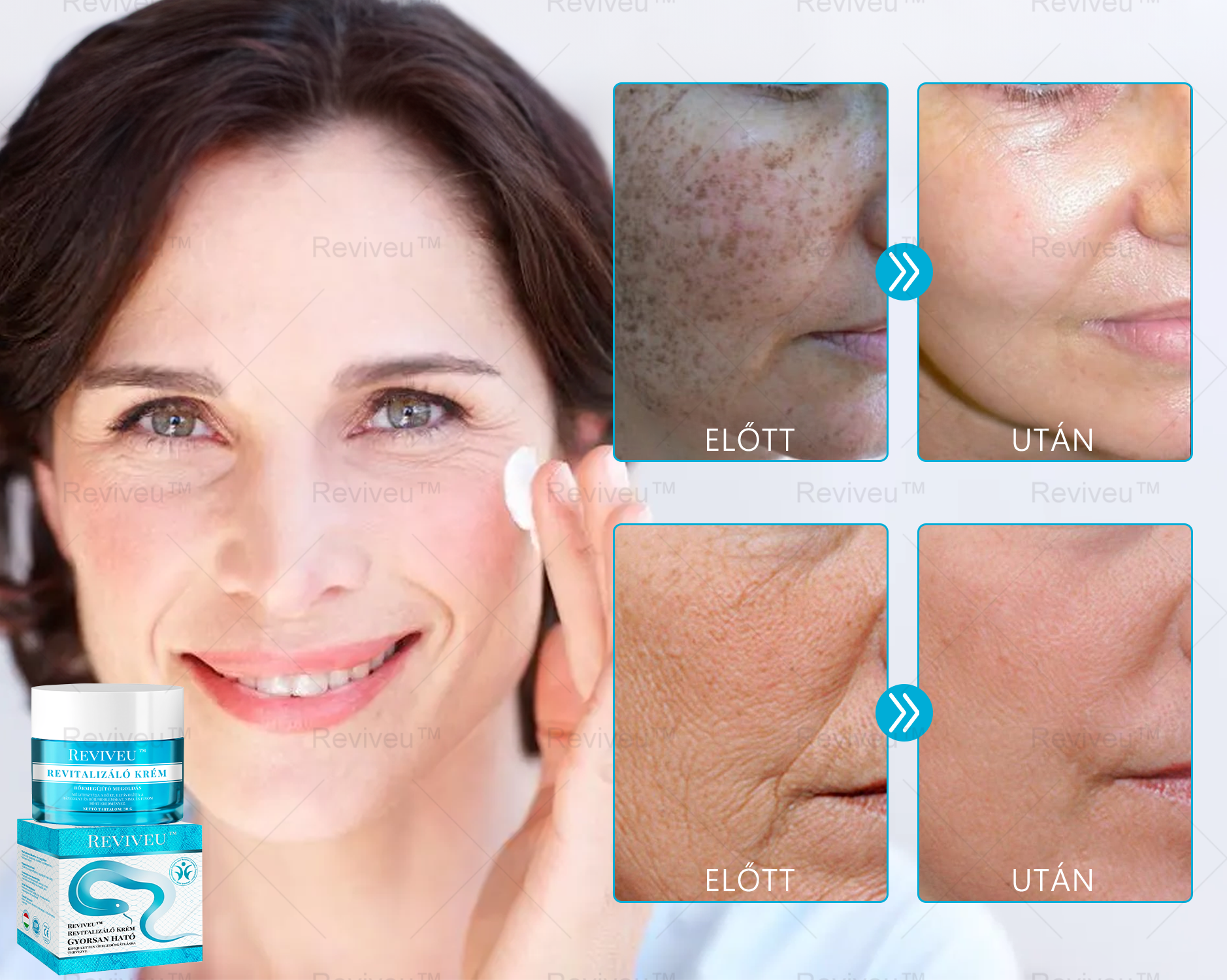 “Az arcomon lévő ráncok miatt mindig is aggódtam, egészen addig, amíg ki nem próbáltam a Reviveu™ Revitalizáló Krémet! Az eredmény megdöbbentett, a barátaim mind azt mondták, hogy tíz évvel fiatalabbnak nézek ki! Nem is gondoltam volna, hogy csak egy próbát teszek, és mégis ilyen csodálatos változást hoz!"
